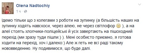 За її словами, патрульні обмежуються лише усними роз’ясненнями і попередженнями, не штрафуючи людей. Сума штрафу, передбачена адміністративним кодексом за подібне порушення правил дорожнього руху, складає 51 грн.