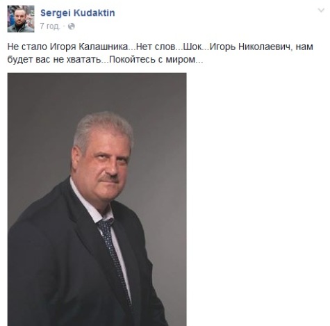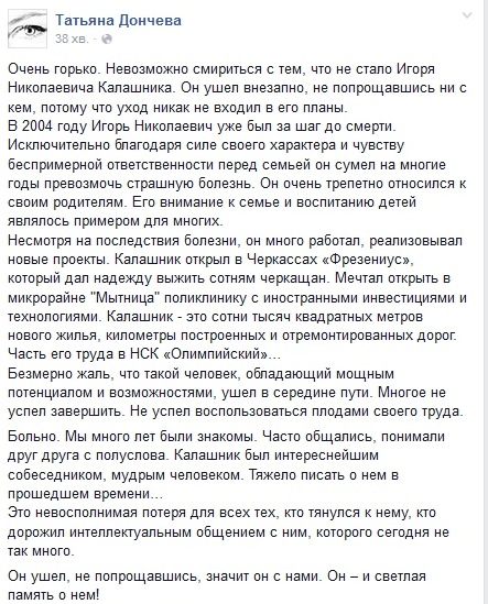 «Пішов із життя мій справжній друг та старший брат Ігор Миколайович Калашник. Довго думав, чи варто про особисті переживання писати тут, але мовчати не можу. Це людина, яка відіграла особливу роль у моєму житті і становленні і як особистості, і як політика. Він завжди був і залишиться для мене взірцем людяності, порядності, Людиною з великої літери. Ми дружили 10 років і я вдячний за кожен день цієї дружби. Навіть моя дружина зранку сказала: «А до кого тепер ми будемо ходити?» Й справді, ми любили бувати у нього в гостях, особливо діти. Ігор був таким привітним, мудрим, сповідував добро і конструктив, умів товаришувати, але вмів і воювати, відстоювати своїх. Відчуття радості від спілкування із ним не можна замінити. Його життя - це приклад для багатьох, як треба жити, виховувати дітей та любити рідне місто. Світла пам'ять!» – написав у «Фейсбуці» колишній секретар міськради Олександр Радуцький.