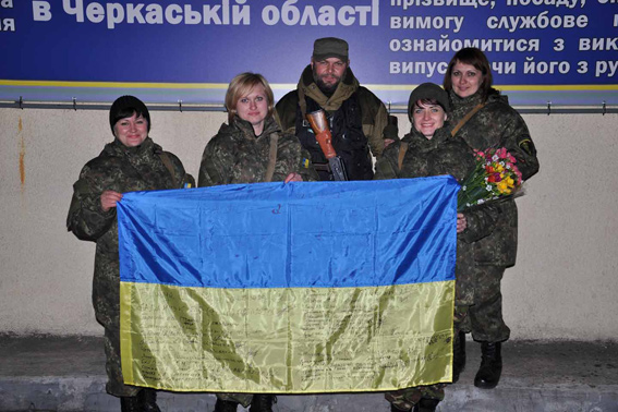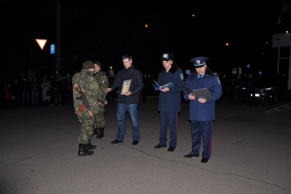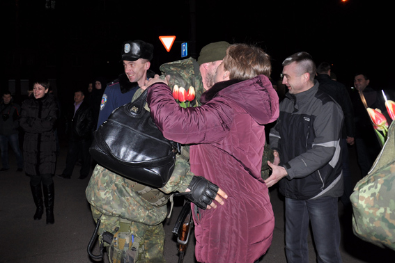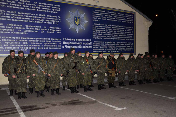 Сьогодні вночі на фасаді Черкаського ГУНП керівництво поліції, рідні, друзі та колеги зустрічали бійців зведеного загону черкаської поліції. Протягом місяця вони перебували на території Донецької області, де несли службу на блокпостах, забезпечували охорону громадського порядку та допомагали місцевому мирному населенню.