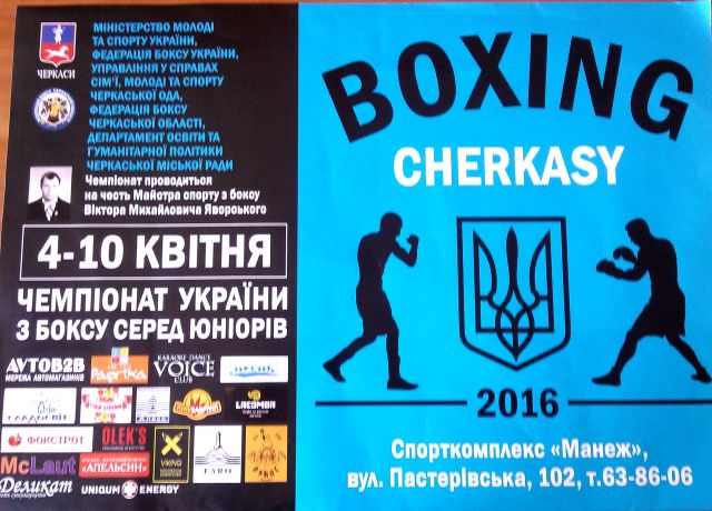4.04-10.04 2016 року в Черкасах відбуватиметься чемпіонат України з боксу серед юніорів 2000-2001 років народження.