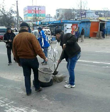 Ремонт доріг по-уманськи. Яма біля 14 школи в яку неодноразово «влітали» автомобілі перетворилася на клумбу. Активісти серед дороги посадили дерево, і поставили постамент - колесо від автомобіля Опель, який став жертвою ями.