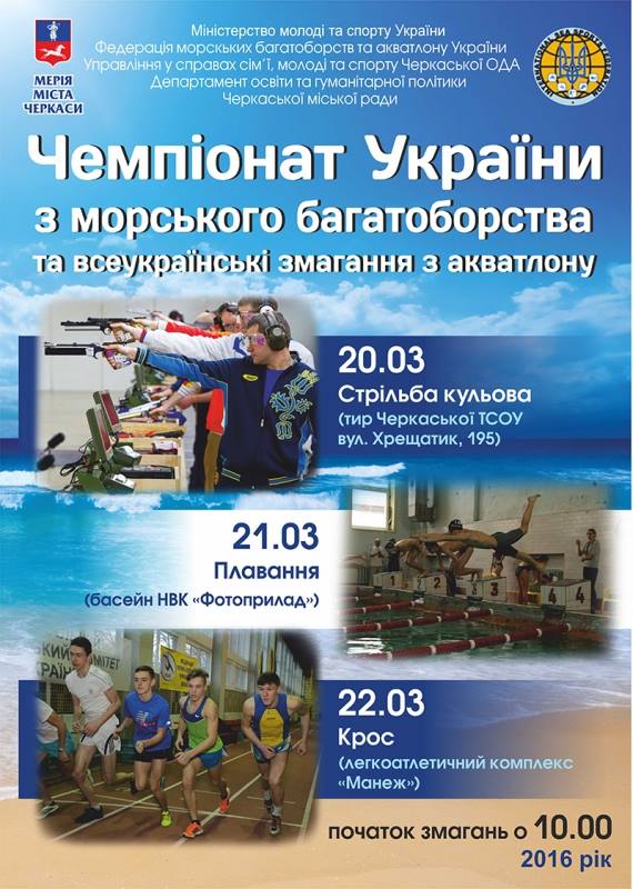 Чемпіонат України з морського багатоборства та всеукраїнські змагання з акватлону приймуть Черкаси 20-22 березня 2016 року.