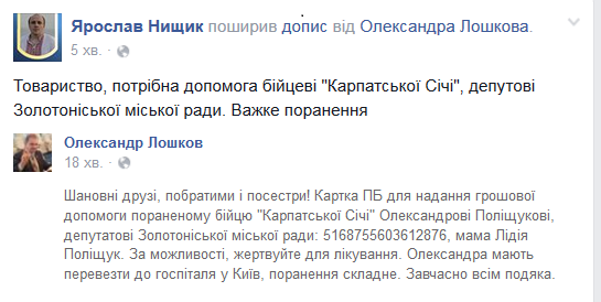 «Дізнався про поранення побратима, члена ВГО «Сокіл», депутата Золотоніської міської ради Олександра Поліщука. Сашко служить у підрозділі «Карпатська Січ» 93-ї ОМБ, пішов добровольцем. Крім друга Сашка поранення отримали ще декілька бійців. Наразі із Сашком усе добре, йому зробили операцію і він знаходиться у госпіталі», - повідомив Максим Шило.
