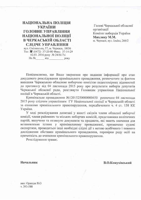 У відповідь на запит було повідомлено, що Кримінальне провадження розпочате за ознаками кримінального правопорушення, передбаченого ч. 4 ст. 158 КК України (фальсифікація виборчих документів). Як і очікувалось, наразі нічого сенсаційного поліція не може повідомити. Допитані свідки, вилучені документи, відбулись експертизи інші необхідні слідчі дії. Розслідування триває.