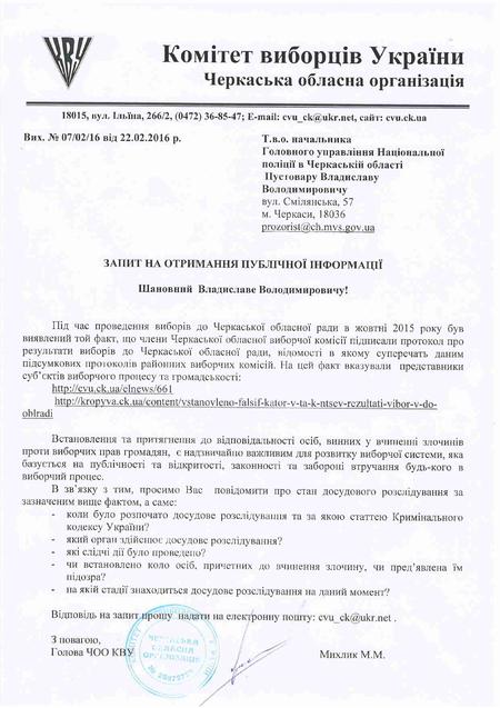 Черкаська обласна організація КВУ продовжує відслідковувати процеси, пов’язані з фальсифікаціями виборів до Черкаської обласної ради в жовтні 2015 року.