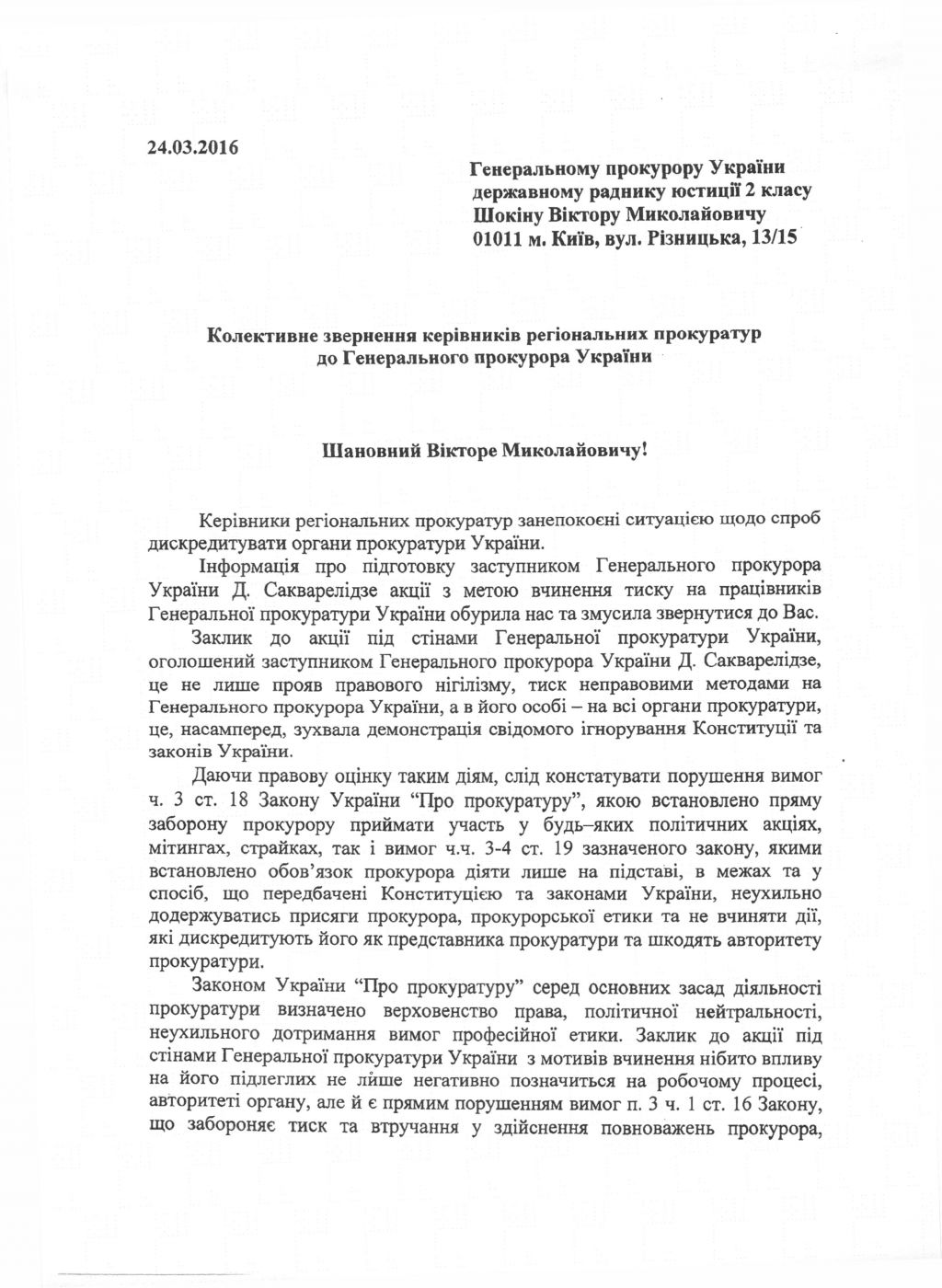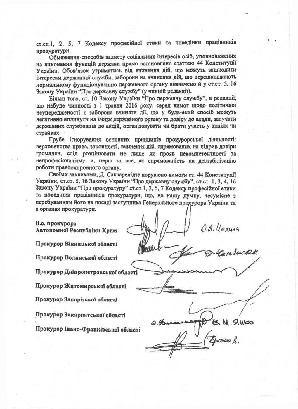 «Заклик до акції під стінами Генеральної прокуратури України, оголошений заступником Генерального прокурора України Д. Сакварелідзе, це не лише прояв правового нігілізму, тиск неправовими методами на Генерального прокурора України, а в його особі - на всі органи прокуратури, це, насамперед, зухвала демонстрація свідомого ігнорування Конституції та законів України», - йдеться у листі.