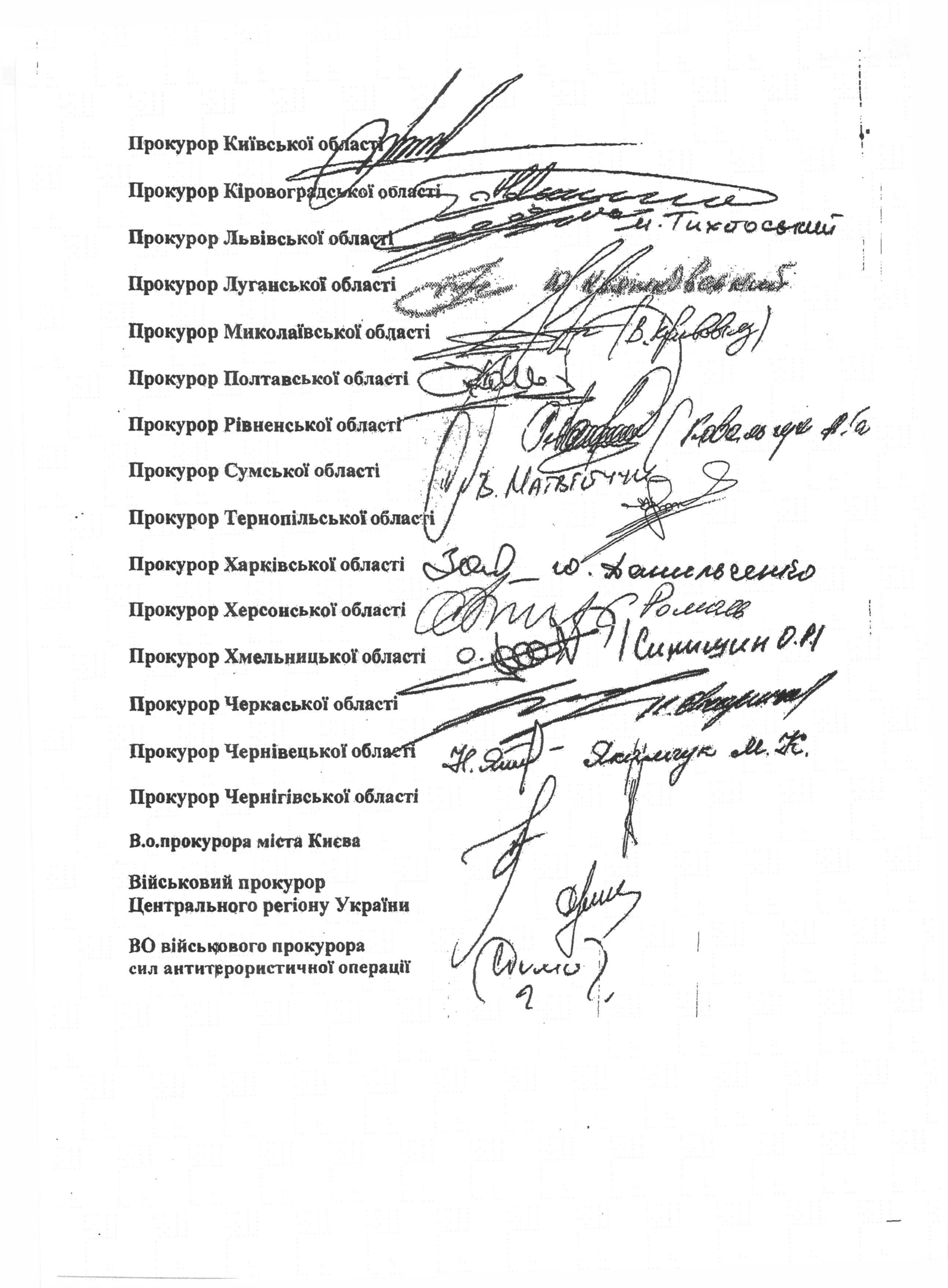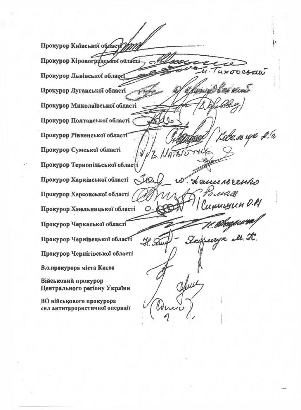 Підписи поставили керівники обласних прокуратур, а також в. о. прокурора Києва, військовий прокурор Центрального регіону України та в. о. військового прокурора сил антитерористичної операції.