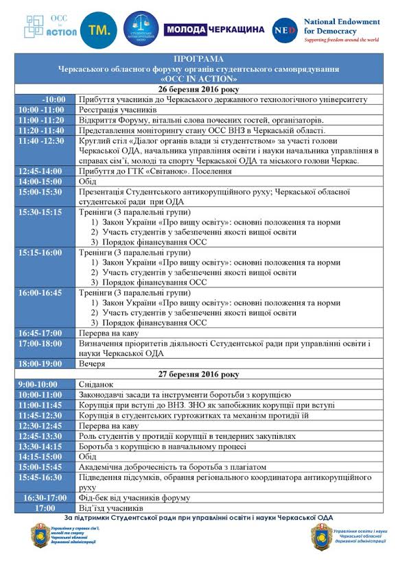 Офіційне відкриття форуму заплановане на 11 годину 26 березня в 105 аудиторії 1-го корпусу (конференц-зал) Черкаського державного технологічного університету. На відкриття форуму запрошені голова Черкаської ОДА, голова Черкаської облради, міський голова Черкас, начальник управління в справах сім’ї, молоді та спорту і начальник управління освіти і науки Черкаської ОДА, які приймуть участь у відкритому діалозі студентства з владою.