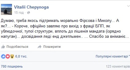 «Думаю, треба якось підтримать морально Фірсова і Миколу... А як?... - Короче, офіційно заявляю про вихід з фракції БПП... досвідання леді енд джетльмен.. ... Спасібо за вніманіє», – висловився нардеп.