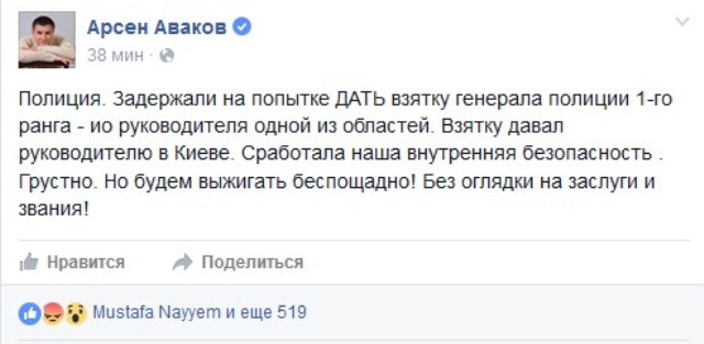 «Полиция. Задержали на попытке ДАТЬ взятку генерала полиции 1-го ранга – и. о. руководителя одной из областей. Взятку давал руководителю в Киеве. Сработала наша внутренняя безопасность Грустно. Но будем выжигать беспощадно! Без оглядки на заслуги и звания!», - написав у Фейсбуці Арсен Аваков.