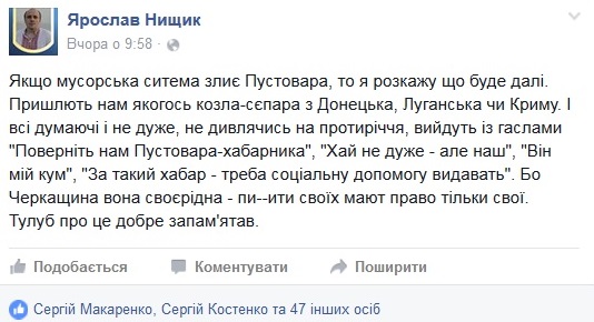 «Якщо мусорська ситема злиє Пустовара, то я розкажу що буде далі. Пришлють нам якогось козла-сєпара з Донецька, Луганська чи Криму. І всі думаючі і не дуже, не дивлячись на протиріччя, вийдуть із гаслами "Поверніть нам Пустовара-хабарника", "Хай не дуже - але наш", "Він мій кум", "За такий хабар - треба соціальну допомогу видавать". Бо Черкащина вона своєрідна - пи--ити своїх мают право тільки свої. Тулуб про це добре запам'ятав», – зазначив Нищик.