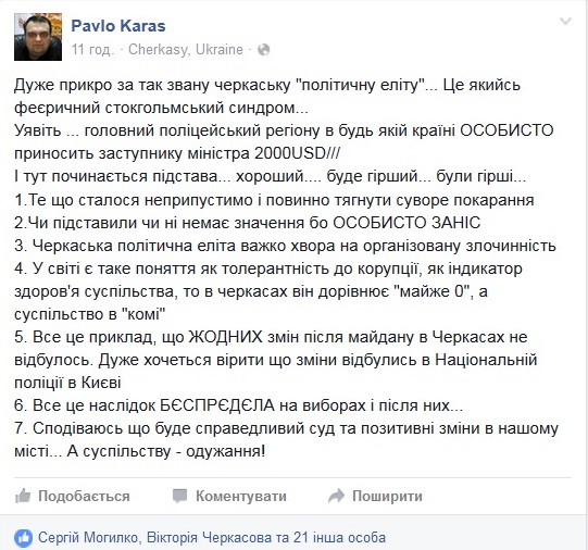 «Дуже прикро за так звану черкаську "політичну еліту"... Це якийсь феєричний стокгольмський синдром... Уявіть ... головний поліцейський регіону в будь якій країні ОСОБИСТО приносить заступнику міністра 2000USD. І тут починається підстава... хороший.... буде гірший... були гірші... 1.Те що сталося неприпустимо і повинно тягнути суворе покарання. 2.Чи підставили чи ні немає значення бо ОСОБИСТО ЗАНІС. 3. Черкаська політична еліта важко хвора на організовану злочинність. 4. У світі є таке поняття як толерантність до корупції, як індикатор здоров'я суспільства, то в черкасах він дорівнює "майже 0", а суспільство в "комі". 5. Все це приклад, що ЖОДНИХ змін після майдану в Черкасах не відбулось. Дуже хочеться вірити що зміни відбулись в Національній поліції в Києві 6. Все це наслідок БЄСПРЄДЄЛА на виборах і після них... 7. Сподіваюсь що буде справедливий суд та позитивні зміни в нашому місті... А суспільству - одужання!» – пише Павло Карась.