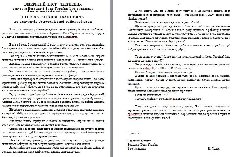 Екс-нардеп просить депутатів районної ради і керівників Золотоніщини «виступити з ініціативою про повторне розслідування, присічення хамства окремих чиновників і горе-спеціалістів до простих, хворих та небайдужих в цьому житті людей».