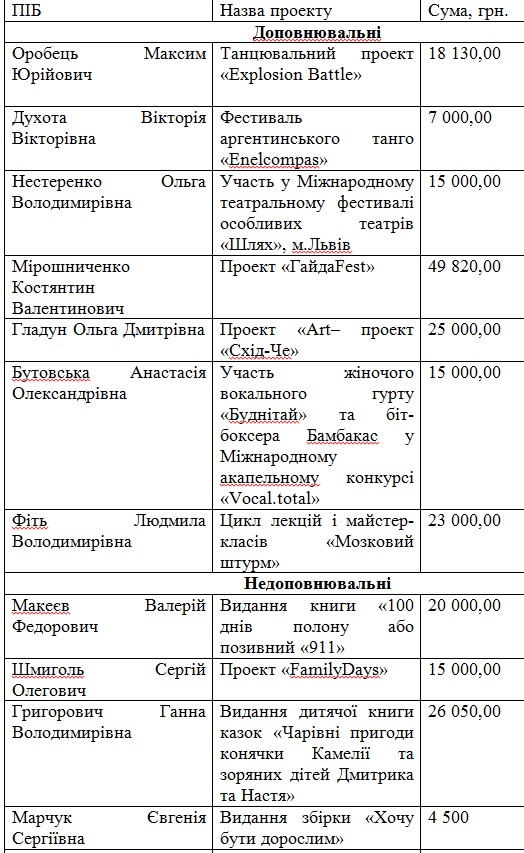 На розгляд Експертної ради було подано 25 проектів на загальну суму 700 201,24 грн., з них 12 – на видання книг, збірок, каталогів, альбомів, 3 – на участь у конкурсах, культурних подіях, 10 – на проведення культурно-мистецьких заходів, фестивалів, проектів тощо. Із загальної кількості 13 проектів – недоповнювальні (283 964, 24 грн.), 12 – доповнювальні (416 237,00 грн.).