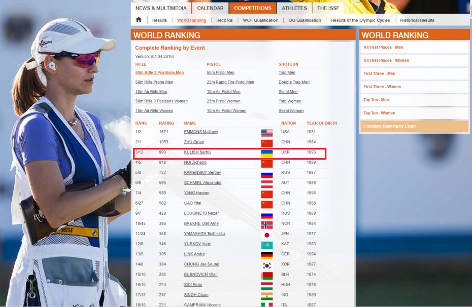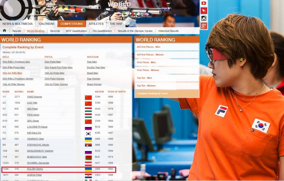 Міжнародна федерація стрільби представила рейтинг спортсменів світу. Сергій куліш, майстер спорту України міжнародного класу, вихованець КДЮСШ №2 Черкаської міської ради - ШВСМ Черкаської обласної ради посідає 3 сходинку у вправі МГ 6 – стрільба з трьох положень та 13 у стрільбі з пневматичної зброї.