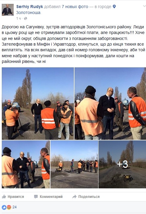 «Дорогою на Сагунівку, зустрів автодорівців Золотоніського району. Люди в цьому році ще не отримували заробітної плати, але працюють!!! Хоча це не мій округ, обіцяв допомогти з погашенням заборгованості», - написав Рудик.