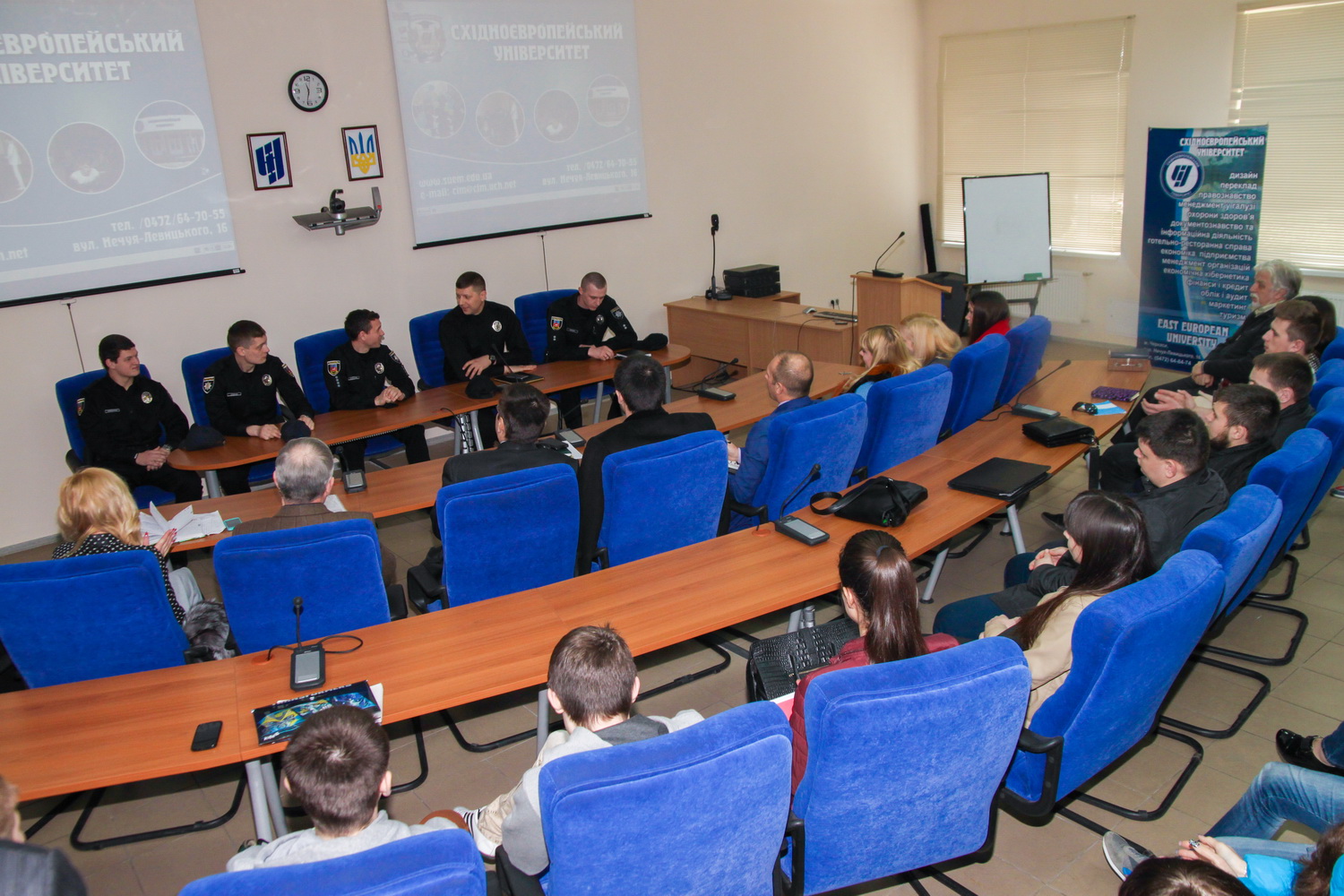 Про функції патрульної поліції та ставлення молоді до новоствореної служби говорили у Східноєвропейському університеті економіки і менеджменту. 6 квітня до навчального закладу завітали начальник Управління патрульної поліції в м. Черкасах Вадим Лісничук, перший заступник начальника Олександр Кокоба, патрульні Олександр Кондратюк, Олександр Літвінов і Антон Червоненко.