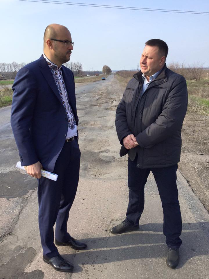 Фотографувався на фоні розбитих доріг він разом з керівником Служби автомобільних доріг в Черкаській області Юрієм Настенком.