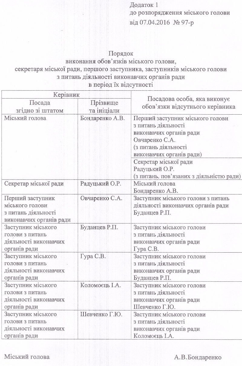 Розпорядженням міського голови від 7 квітня визначено порядок виконання обов’язків міського голови, секретаря міської ради, першого заступника, заступників міського голови з питань діяльності виконавчих органів радив період їх відсутності та розподіл обов’язків.