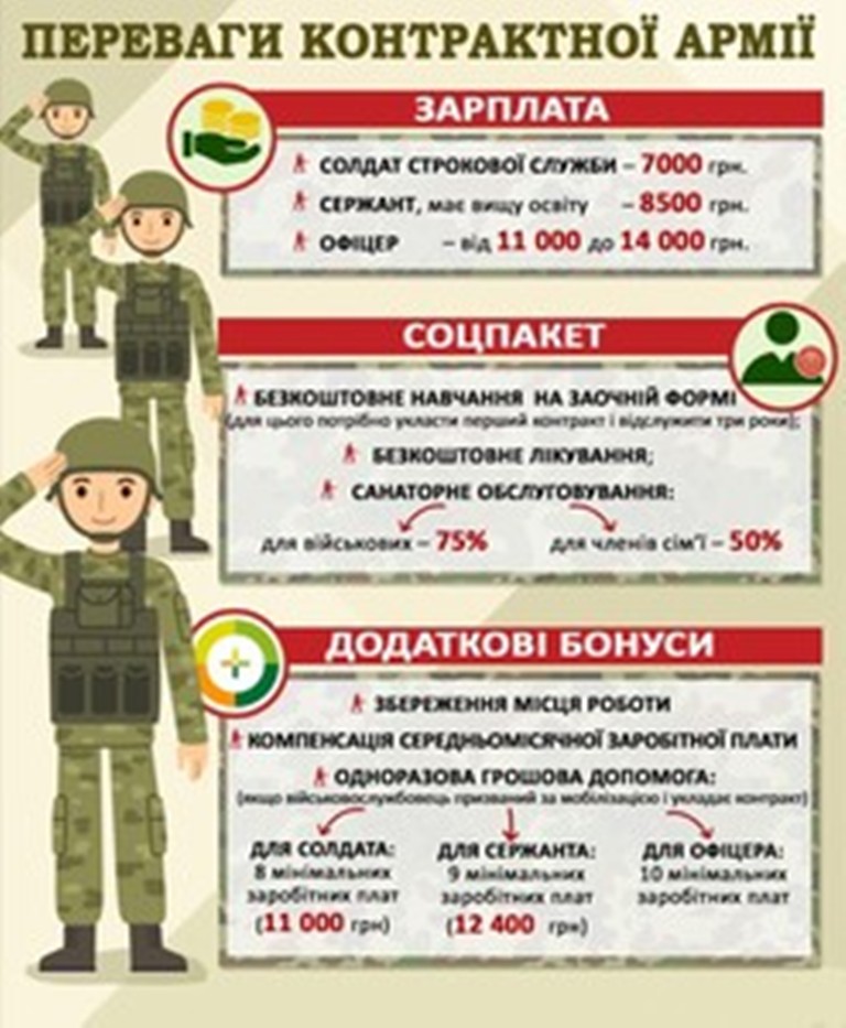 Взагалі, служити в армії на контрактній основі мають право особи віком від 18 до 60 років із задовільним станом здоров’я. Охочим змінити цивільний одяг на військовий стрій гарантується заробітна плата, що стартує від 7 000 грн, додаткові кошти у разі перебування у зоні проведення АТО, соціальний захист, курортне лікування та відпочинок у санаторіях, речове забезпечення відповідно до визначених норм, участь у складі національно-миротворчих місій.