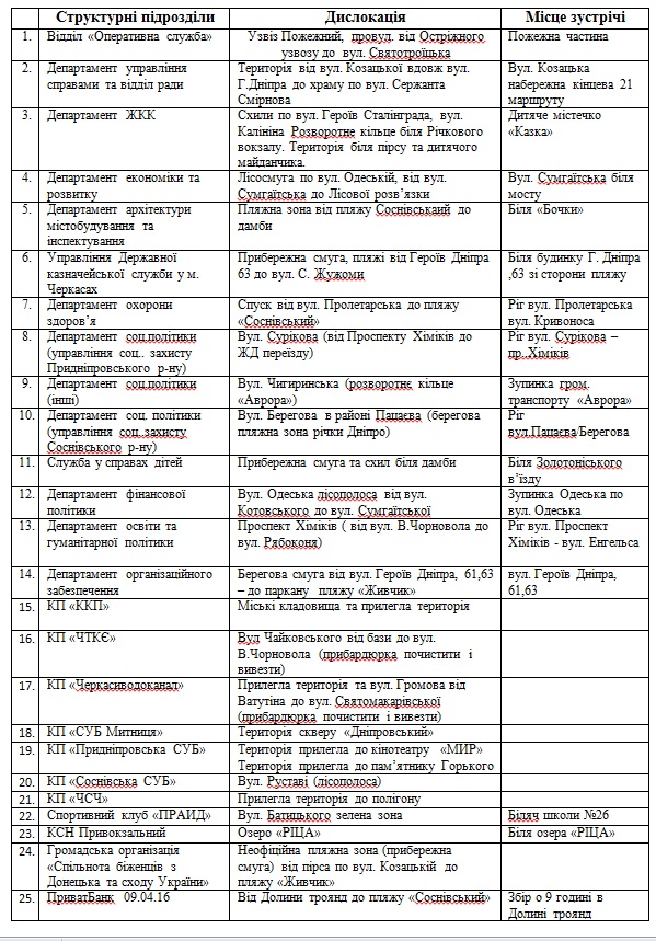 Долучаться до спільної справи також керівництво Черкаської міської ради, депутати та працівники міськвиконкому, за кожним департаментом та управлінням буде закріплена окрема територія.