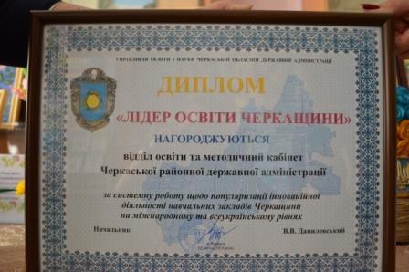 За впровадження перспективного педагогічного досвіду та за системну роботу щодо популяризації інноваційної діяльності навчальних закладів Черкащини на міжнародному та всеукраїнському рівнях диплом «Лідер освіти Черкащини» цьогоріч отримали освітяни Черкаського району. Про це йдеться на сайті Черкаської РДА.