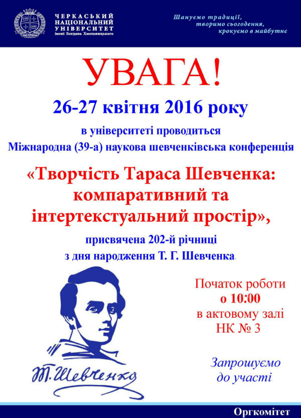 Запрошуємо до участі в Міжнародній (39-й) науковій шевченківській конференції, присвяченій 202-й річниці з дня народження Т. Г. Шевченка, яка відбудеться в Черкаському національному університеті імені Богдана Хмельницького 26-27 квітня 2016 року.