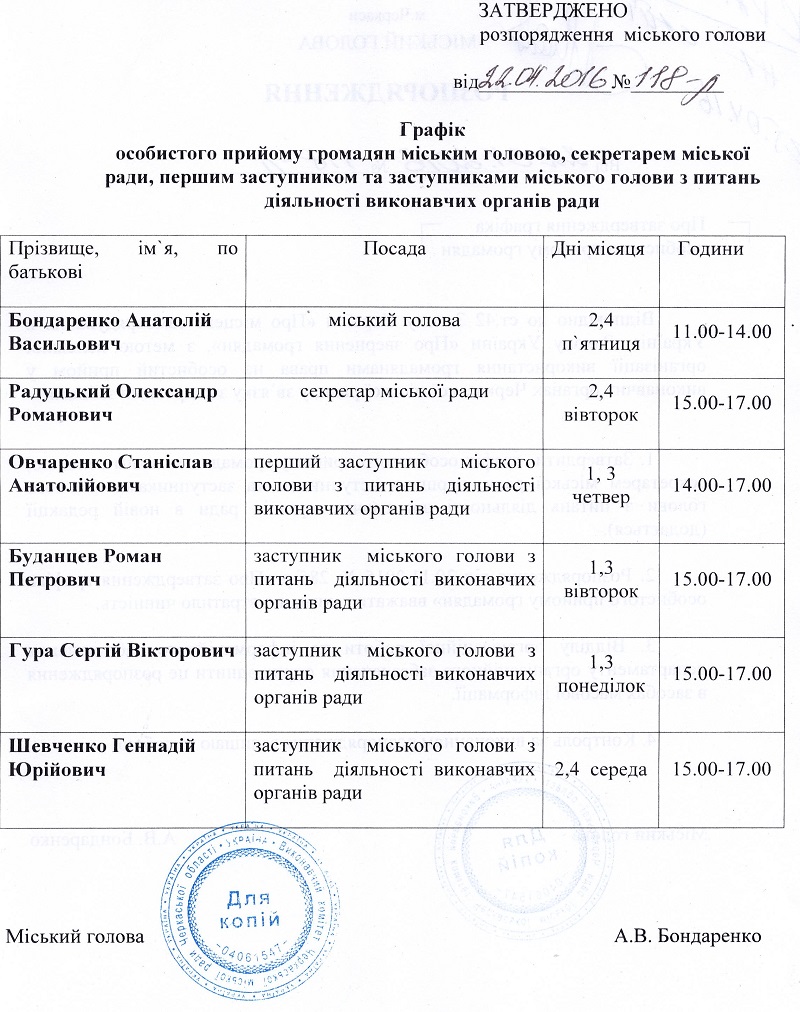 Розпорядженням міського голови затверджено графік особистого прийому громадян міським головою Анатолієм Бондаренком, секретарем міської ради Олександром Радуцьким, першим заступником міського голови з питань діяльності виконавчих органів ради Станіславом Овчаренком та заступниками міського голови з питань діяльності виконавчих органів ради Романом Буданцевим, Сергієм Гурою та Геннадієм Шевченком.