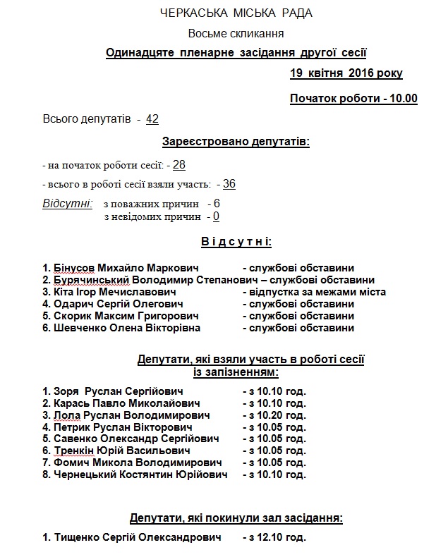 Відділ з питань роботи ради інформує про відвідування депутатами одиннадцятого пленарного засідання другої сесії, яке відбулося 19 квітня 2016 року.