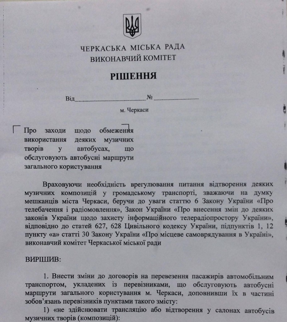 Виконавчий комітет заборонив музику у громадському транспорті Черкас, пише "Інфоміст".