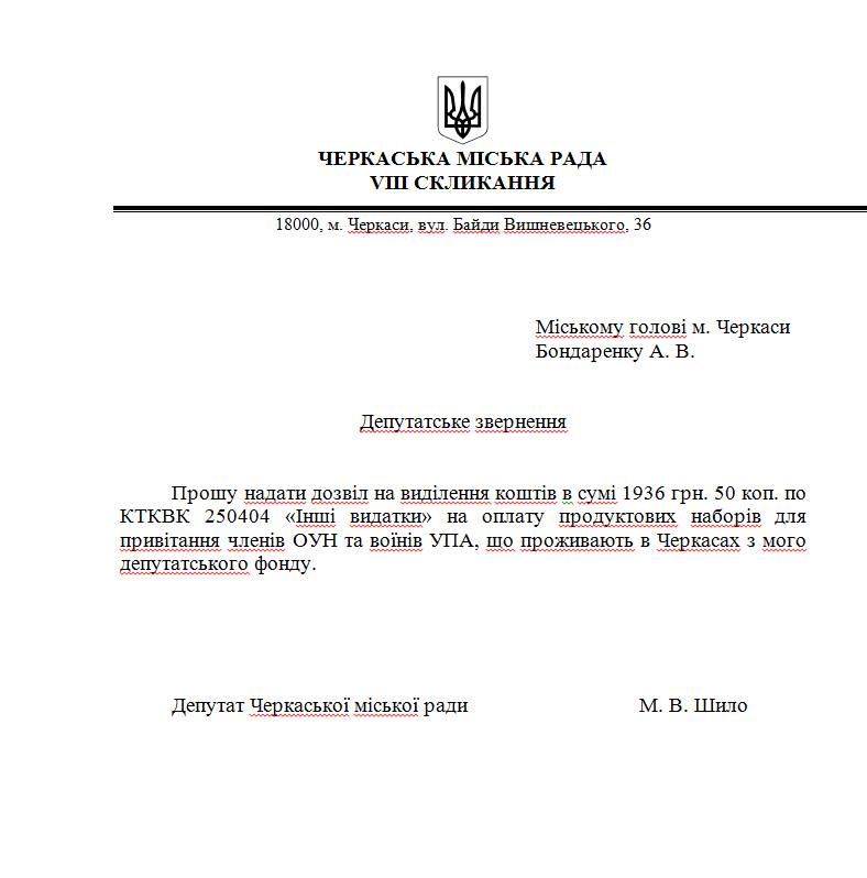8 травня у Черкасах вітатимуть ветеранів УПА, які живуть у місті. Для цього депутат міськради Макисим Шило із свого депутатського фонду виділив 1936 грн 50 копійок. Про це він написав у Фейсбуці.