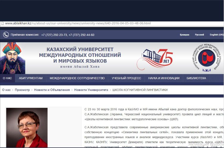 Протягом десяти днів професор Черкаського національного університету імені Богдана Хмельницького Світлана Жаботинська читала лекції науково-педагогічним співробітникам Казахського університету міжнародних відносин і світових мов імені Абилай-хана.