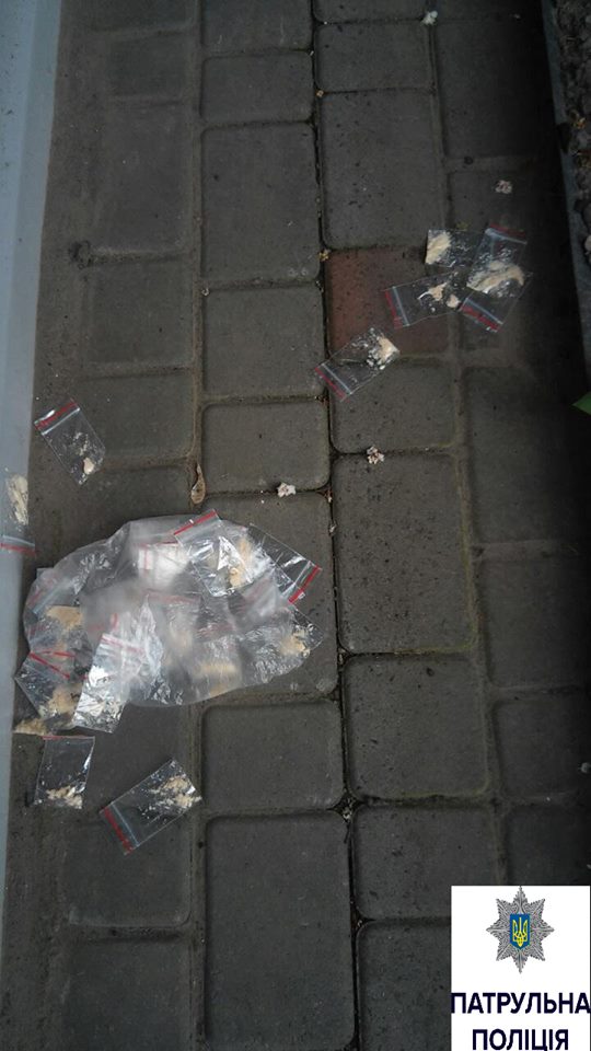 Інспектори зупинили автомобіль та щойно з нього вийшли, як парубок кинувся навтьоки. Наздогнати його патрульним не вдалося бо молодик зник у дворах будинків. Тікаючи чоловік викинув згорток, у якому, як пізніше виявилось, знаходилось 8 пакетиків подрібненої речовини рослинного походження, схожої на канабіс та 32 пакети порошку білого кольору, схожого на амфетамін.