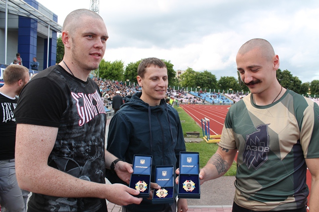 Нагороджені двоє миколаєвців – Анатолій Дрьомов (позивний “Сумчанин”) та Ілля Зелінський (позивний “Поганка”) і двоє черкащан – Ігор Третьяк (позивний “Голд”) та Євген Гаркавий (позивний “Гарік”). У складі полку “Азов” черкащани – з травня 2014 року, а миколаєвці – з вересня того ж року. ”Голд” відзначився у боях за Мар’їнку та під Іловайськом, троє інших – під час визволення і оборони Широкіного (а “Гарік” – ще й у боях під Гранітним).