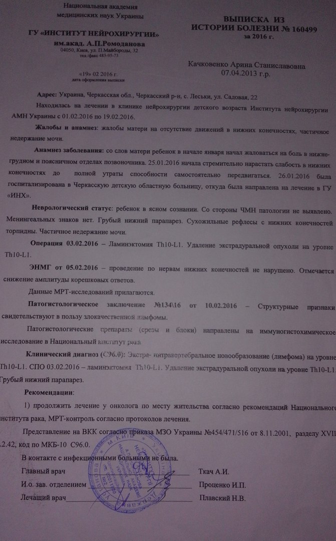 Дівчинку терміново прооперували у столичній лікарні. В Інституті раку, де робили цей аналіз, в лікуванні сім'ї дівчинки відмовили за відсутністю вільних місць та направили на лікування за місцем проживання в Черкаський обласний онкоденспансер.