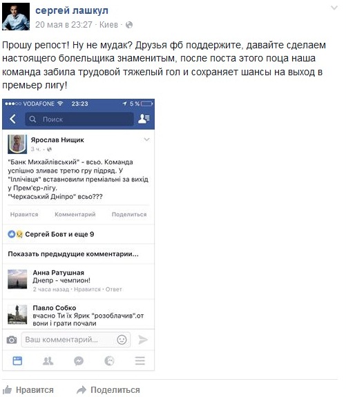 Перший віце-президент корпорації «Міжнародне фізкультурно-спортивне об’єднання «Футбольний клуб «Черкаський Дніпро» Сергій Лашкул у Фейсбуці вкрай критично висловився в адресу депутата Черкаської міськради Ярослава Нищика.