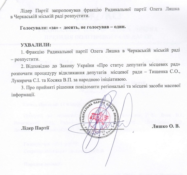 Нагадаємо, відповідне рішення було ухвалено президією партії 12 квітня. Тоді попрощатися із черкаськими "радикалами" (Станіслав Лукирич, Віталій Косяк і Сергій Тищенко) вирішили, бо депутати, зокрема, саботували запровадження системи прозорого механізму здійснення державних закупівель. Цим вони спричинили дискредитацію РПЛ перед партійцями та громадянами у Черкаській області.