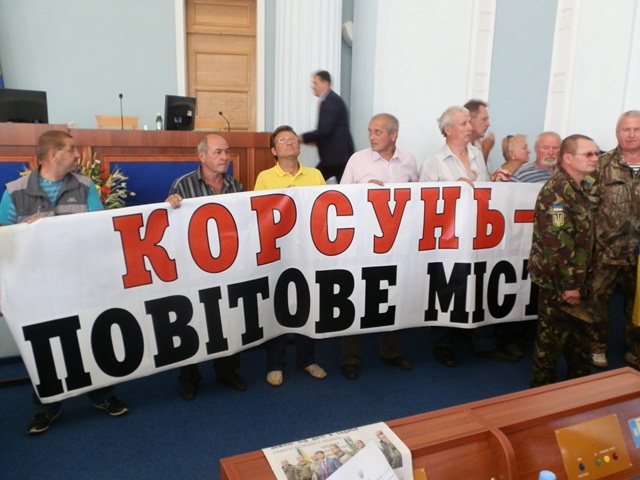 - Знищується Корсунь-Шевченківський район. Він переходить до Звенигородського району. Це все робиться кулуарно. Ми не згодні з цим. 8,5 тисяч корсунців зібрали свої підписи у протест проти цього. Сьогодні відбувається обласна сесія – а це питання не виноситься. Ми прийшли спитати, чому облрада мовчить. Наша вимога – зробити Корсунь-Шевченківський повітовим базовим центром.