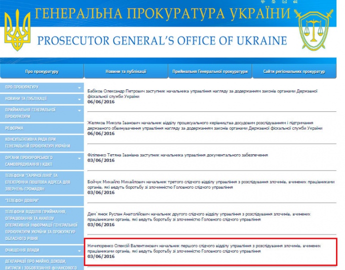 Згідно з ним, Олексій Ничипоренко призначений начальником першого слідчого відділу управління з розслідування злочинів, вчинених працівниками органів, які ведуть боротьбу зі злочинністю Головного слідчого управління.