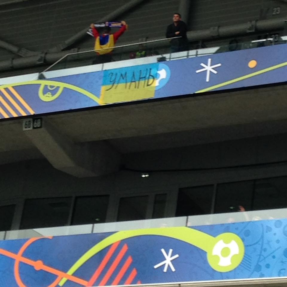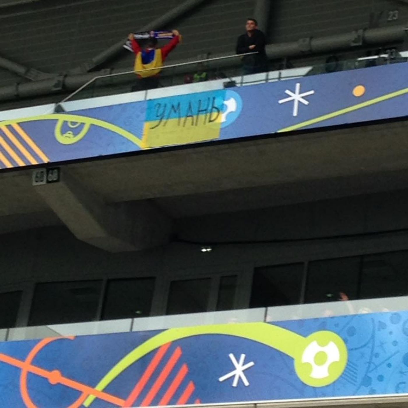 Під час футбольного матчу Україна – Німеччина, на чемпіонаті Європи, що відбувається у Франції, уманчанин Дмитро Проценко вивішав на одному із найбільш помітних місць, прапор України з надписом «Умань». Про це повідомила «Вечірня Умань».