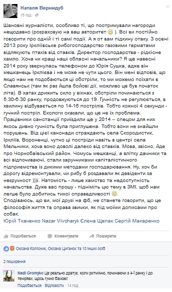 «З осені 2013 року Іркліївське рибогосподарство газовими гарматами відлякує птахів від ставків... – пише пані Наталя. – У хатах дрижить скло у вікнах, обстріли починаються з 5.30-6.30 ранку, тривають до 19. Гучність не регулюється, в хвилину відбувається по 14-16 пострілів. Тобто кожної 4 секунди – гучний постріл. Екологи сказали, що це не їхгя проблема. Працівники санстанції приїздили ще у 2014 – спецом для них якось дивно гучність була приглушена. Тобто вони не знайшли порушень. Від цієї канонади страждають села Скородистик, Іркліїв, Вороненці, чутно ці постріли навіть в центрі села Мельники, хоча воно доволі далеко від ставків. Мова, звісно, йде про Чорнобаївський район. Чомусь мешканці, а влітку дачники та всі відпочиваючі, стали заручниками капіталістичного підприємства із дикими методами господарювання. Ну, хоч би дорогу відремонтували чи рибу б роздавали як дивіденди за незручності».