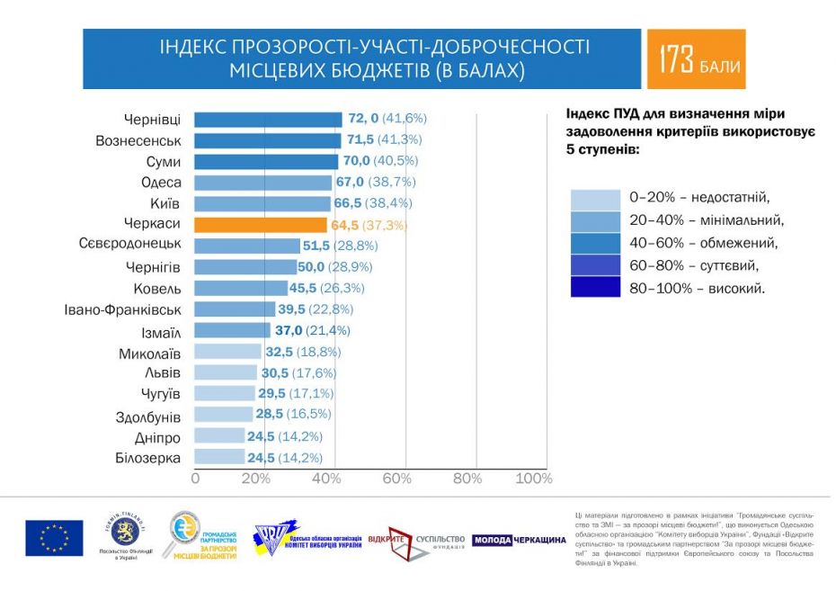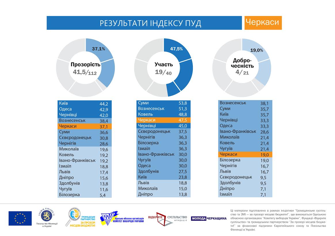 За результатами дослідження, Черкаси отримали 64,5 бали із 173 можливих, що складає 37,3% від загальної кількості балів і зайняв 6 позицію серед 17 українських міст. Це відповідає «мінімальному рівню» забезпечення бюджетної Прозорості, Участі та Доброчесності, і є дещо нижчим за середньозважений показник в 47,4 балів.