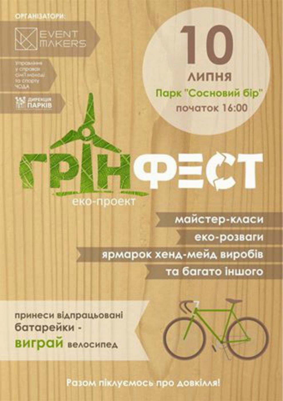 Екологічний проект «Грінфест» відбудеться у парку Сосновий бір на центральній алеї. Зберуться містяни 10 липня о 16.00. Триватиме захід до 19.00.