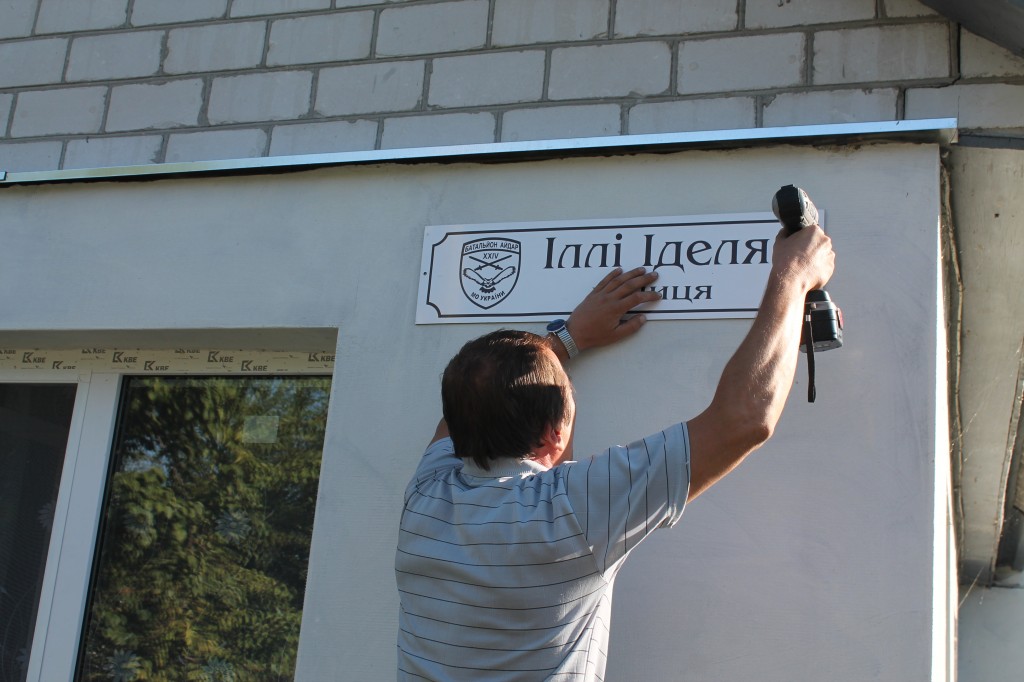 Таблички з новою назвою вулицi виготовлено особистим коштом начальника обласного управлiння культури, а в минулому – шкiльного вчителя Iллi Iделя Олега Островського, з яким вони знову зустрiлися вже в батальйонi «Айдар», у Щастi на Луганщинi…