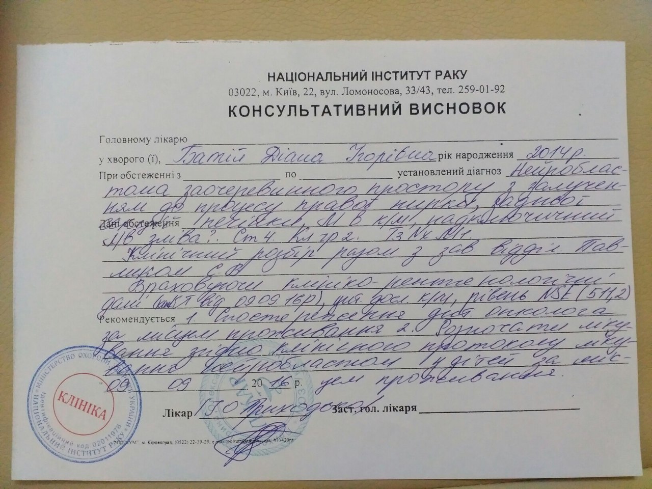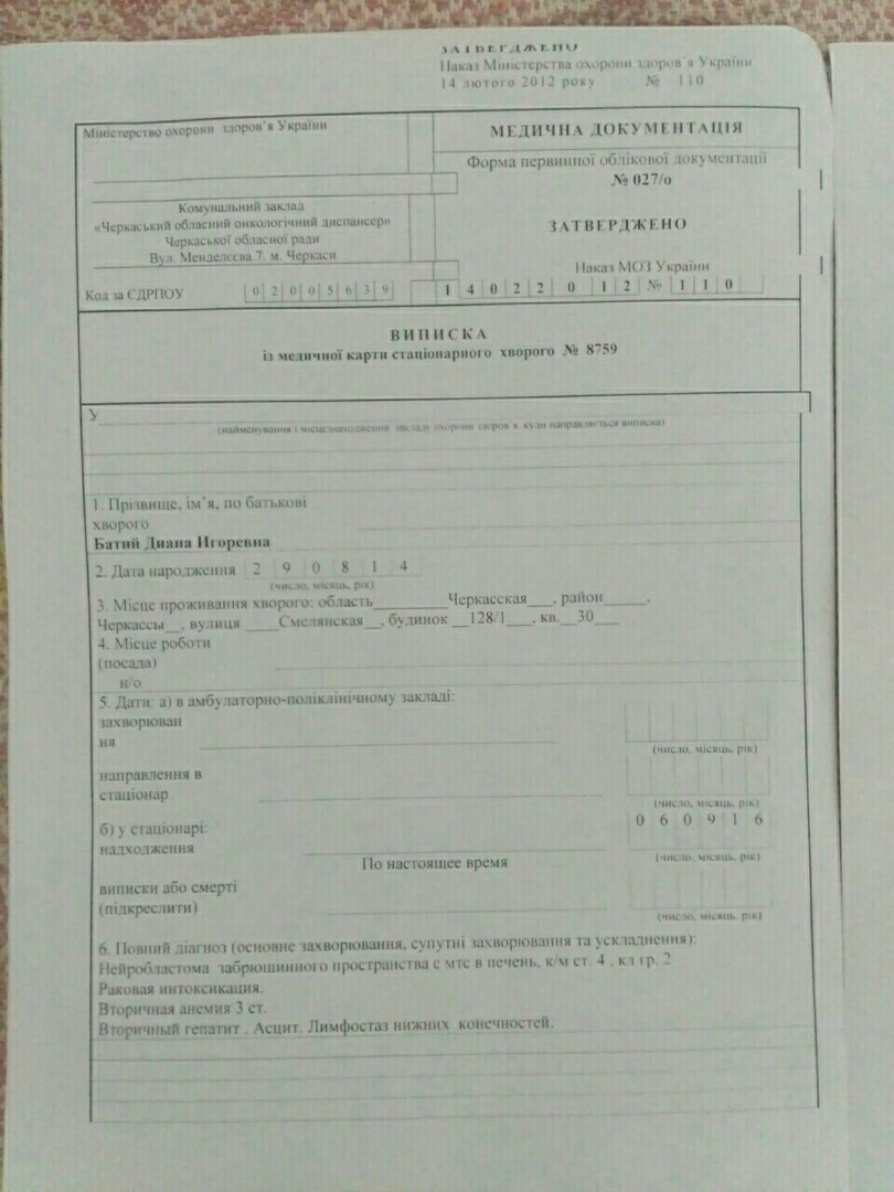 "Допоможіть врятувати доньку! Діаночці 29 серпня виповнилося 2 рочки. А 6 вересня нам діагнозували нейробластому черевного простору 4 стадії (до цього діагнозу додалися ще й ракова інтоксикація, вторинна анемія 3 стадії, вторинний гепатит, асцит, лімфостаз нижніх кінцівок, права нирка не працює). Лікування і реабілітація донечки дуже затратний і довготривалий процес! Прошу, допоможіть нам!!" , - йдеться у повідомленні.