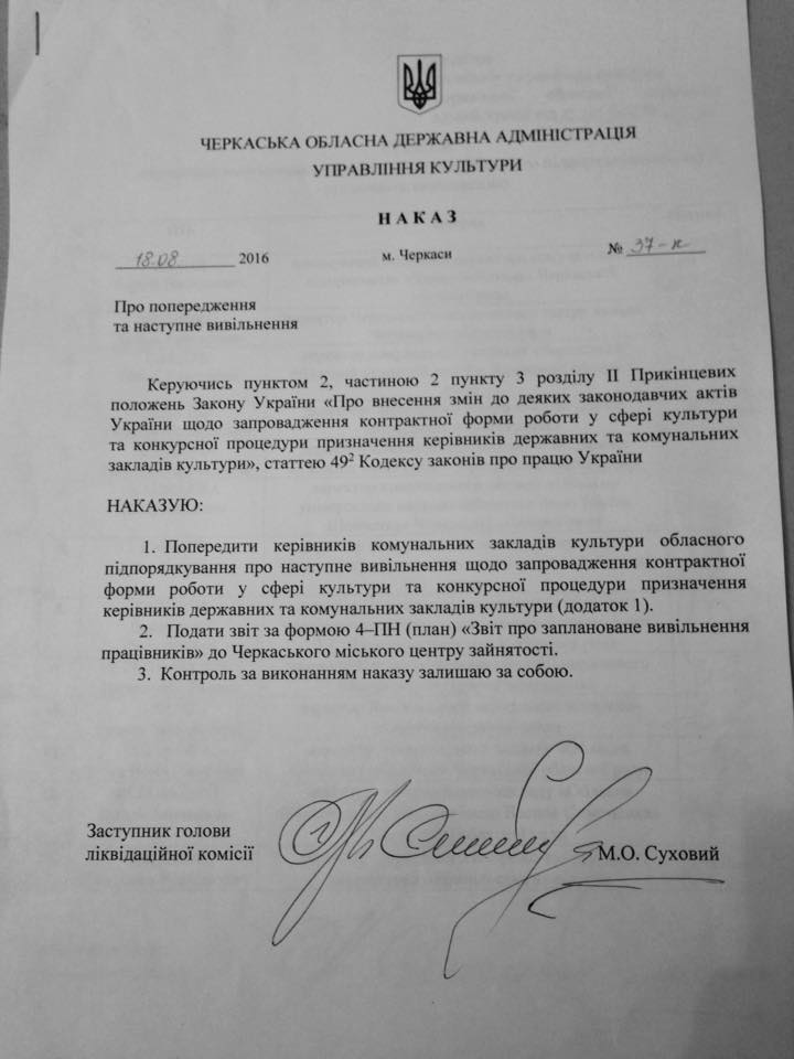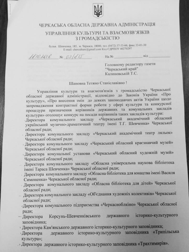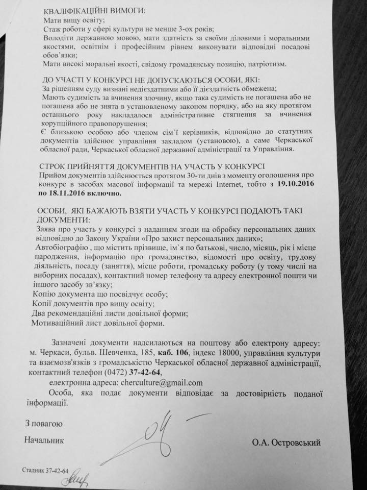 Згідно закону "Про культуру" та змін до нього, на Черкащині оголошено конкурс на посади керівників обласних закладів культури. В Черкаській області є 13 закладів, де потрібно через конкурс відібрати найкращих і призначити на посади. Про це у Фейсбуці повідомив начальник управління культури Черкаскької ОДА Олег Островський.