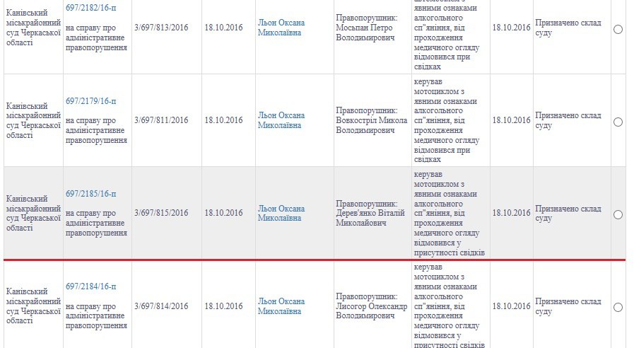 Як зазначається у матеріалах порталу, Віталій Дерев'янко керував мотоциклом з явними ознаками алкогольного сп'яніння та відмовився після власного затримання від проходження медичного огляду у присутності свідків.