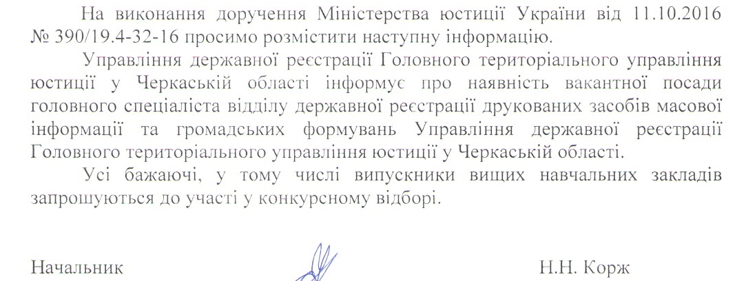 Управління державної реєстрації Головного територіального управління юстиції в області інформує про наявність вакантної посади головного спеціаліста відділу державної реєстрації друкованих ЗМІ та громадських формувань.