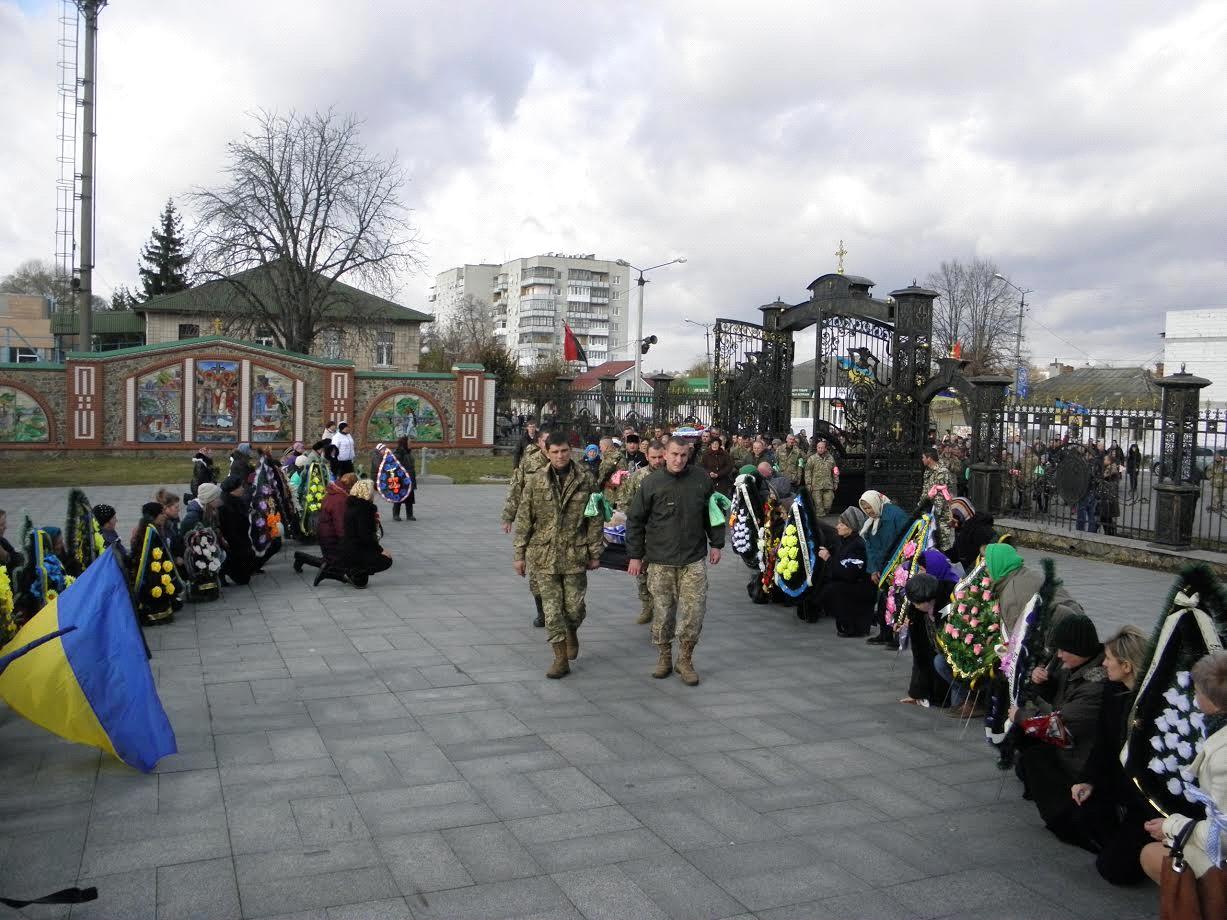 Після короткої відправи у хаті багатолюдна колона вирушила провести земляка в останню путь. Йшли повз батьківську хату Героя України Юрія Паращука. Його іменем віднедавна названа вулиця, на якій жив загиблий. Далі із Святотроїцької на Соборну. Повз пам’ятник гетьманам України, меморіал загиблим на Майдані та у зоні проведення АТО, біля погруддя Тараса Шевченка і до Петропавлівського храму УПЦ Київського патріархату.