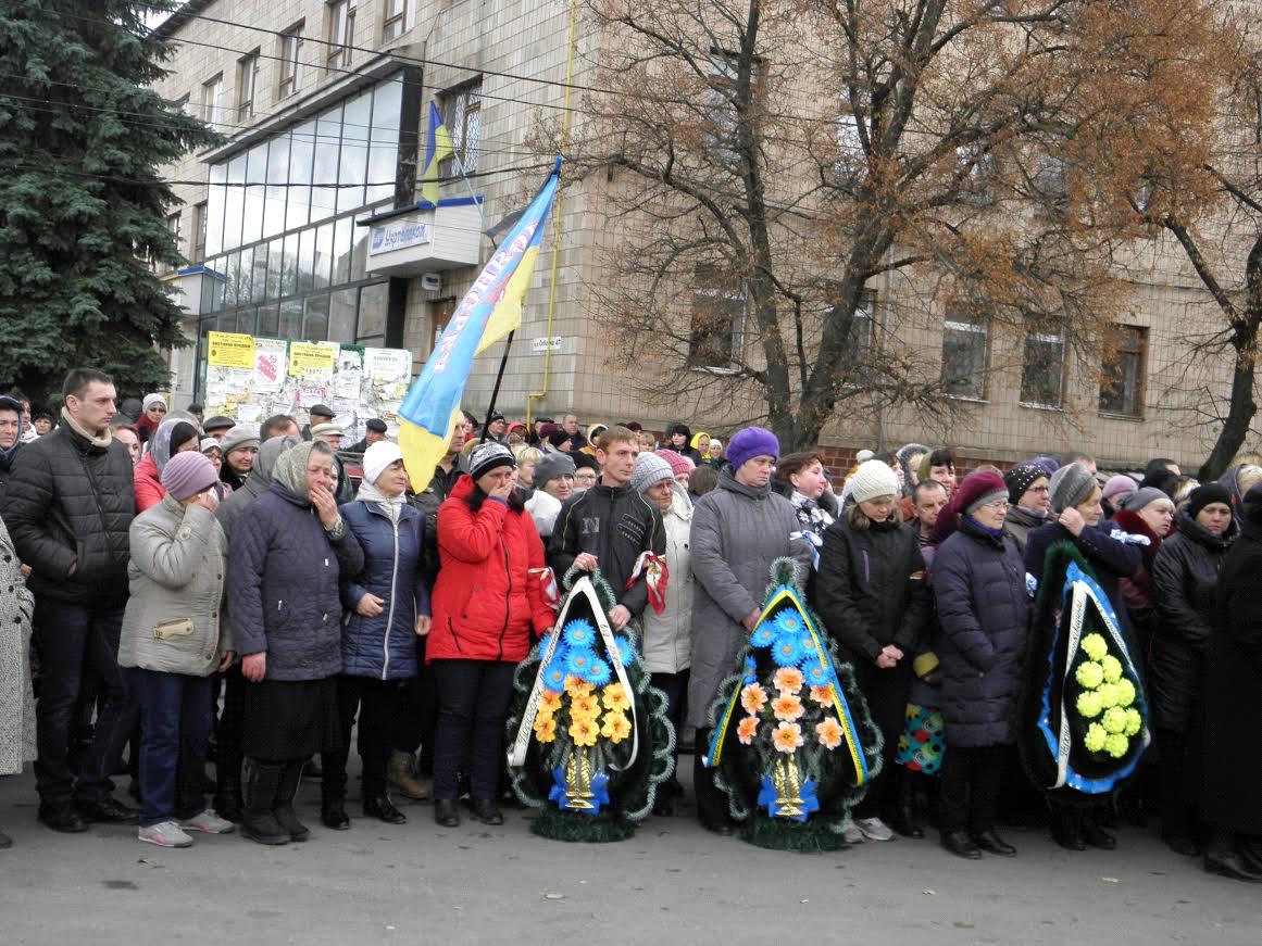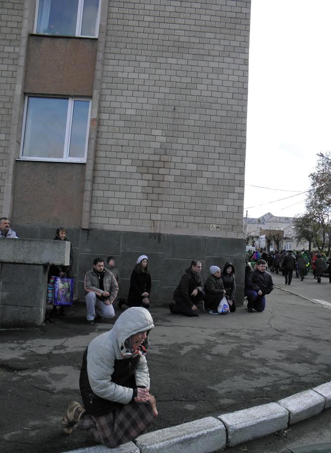 "Схиліть коліно перед загиблим бійцем! Станьте на коліна перед загиблим захисником України! Він віддав життя за нас!", - каже дорогою заступник директора школи №1 Людмила Черепенко і сама стає на коліна. Її слухають, як чиновники, так і пересічні громадяни.